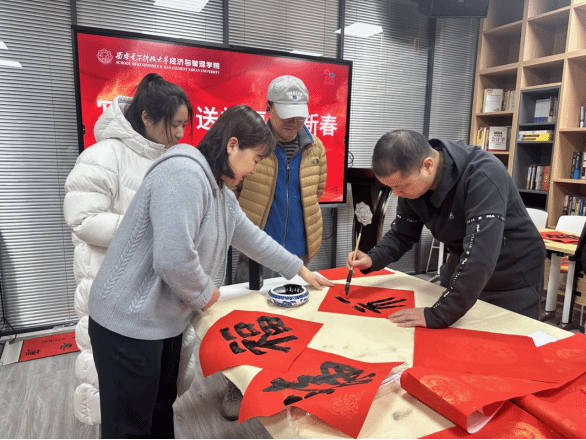 同一时间,在经管院“职工小家”,学院工会打造的“写春联、送祝福、迎新春”活动也进行着。活动现场墨香四溢、年味渐浓,一片喜庆祥和的气氛扑面而来。书法家们挥毫泼墨,通过春联这一载体把“福气”跃然于纸上。学院师生陆续来到现场,精挑细选春联、寄托对新年的美好期待。
