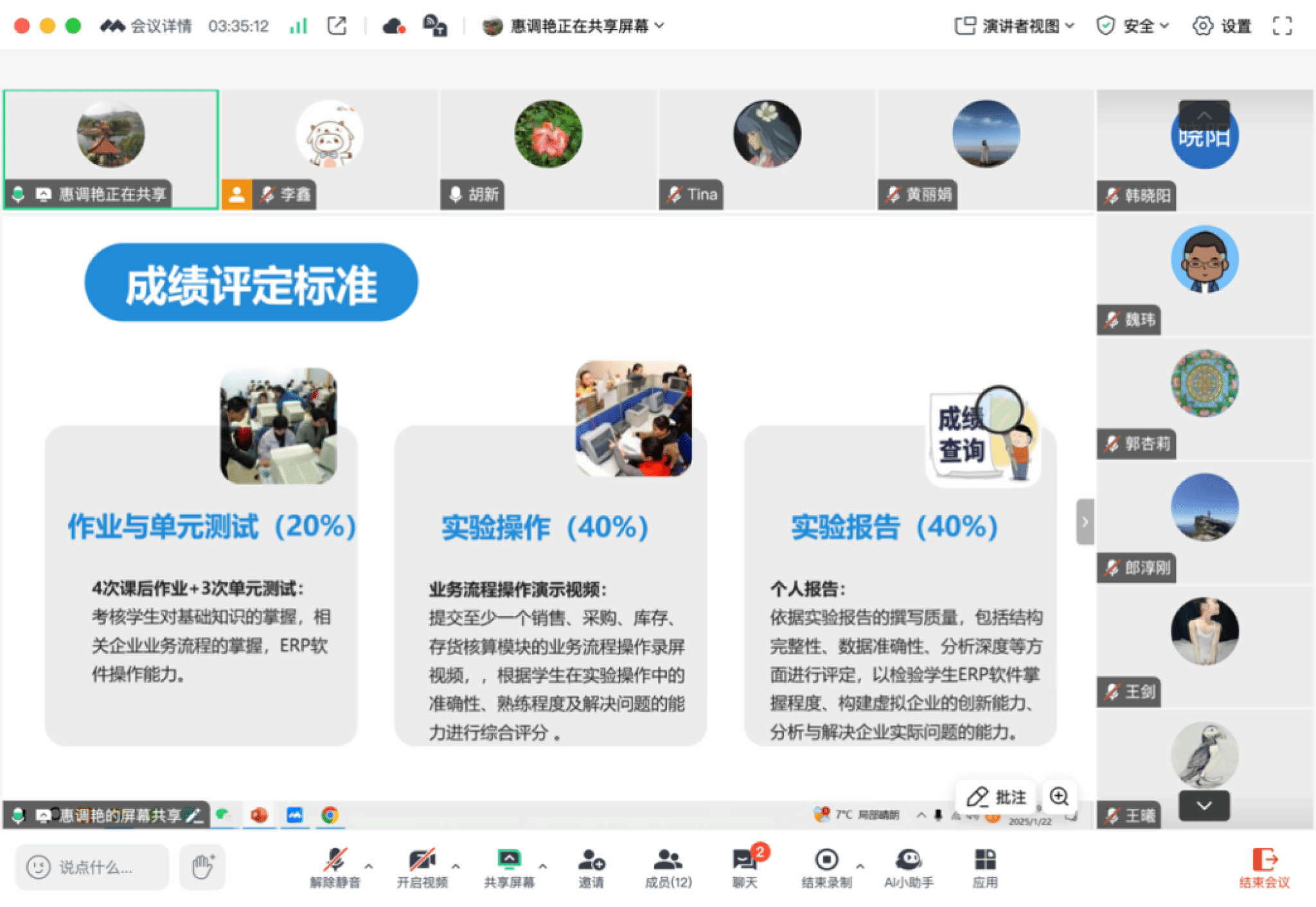 (通讯员:李鑫)1月22日上午,经管院中美合作办学项目举办2025年春季学期2022级中美班课程教师说课活动。本次参与说课的教师包括李光夏、周潇、韩晓阳、郎淳刚、郭杏莉、王曦、王剑、惠调艳、陈丹等9名教师(按说课顺序),胡新、魏玮、黄丽娟等3位校内外专家担任说课评审。中美合作办学项目负责人张卫莉主持本次线上说课。