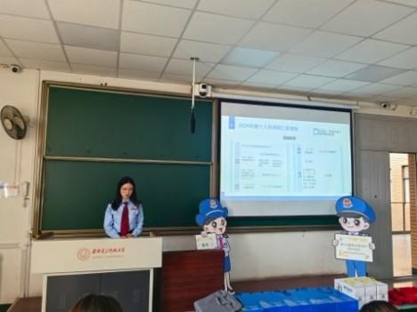 课堂上,西安市第一税务分局税政政管科寇璐璐,向导学团队学生详细讲解税法相关内容。以“个人所得税改革与国家治理现代化”为切入点,将汇算清缴的政策内核拆解为可触可感的现实案例,通过比对年度综合所得与预扣预缴数据,结合大学生勤工助学、实习就业等高频场景,生动诠释了“多退少补”的公平原则。同时引入了数字化税务处理工具“个人所得税APP”,向同学们讲解了作为中国公民,如何利用数字化工具,参与国家税收管理。张蔚虹老师结合智能财税发展现状补充道:“个人所得税APP不仅是便民工具,更是公民参与国家治理的数字接口,是我们参与国家治理的微观实践,每一笔退税补税都在书写着‘取之于民、用之于民’的治理答卷。”同学们摩拳擦掌、迫不及待地想要进行业务实操。