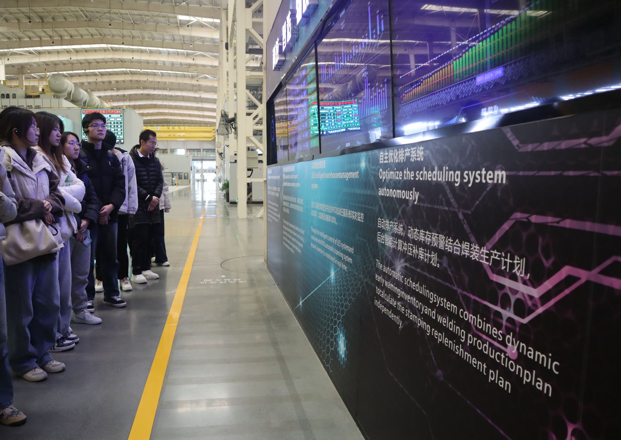 走进焊装车间,工作人员讲解道,在这里,你们能闻到淡淡的冷却液的气味,能看到激光焊接机焊接时迸发的火花。在工作人员的指引下,同学们仔细观察生产线上的可视化看板,可视化看板实时直播安全生产工时与库存动态,每道工序的进度情况被记录并向上反馈,“数智化”管理流程一目了然。参观过程中,张老师和王老师也不时地结合课本知识向同学们讲解可视化看板的内容,大家对吉利汽车“科技、智造、物联、精准、安全”的制造主题有了进一步的了解,对现代技术与智能管理有了更深入的认识。