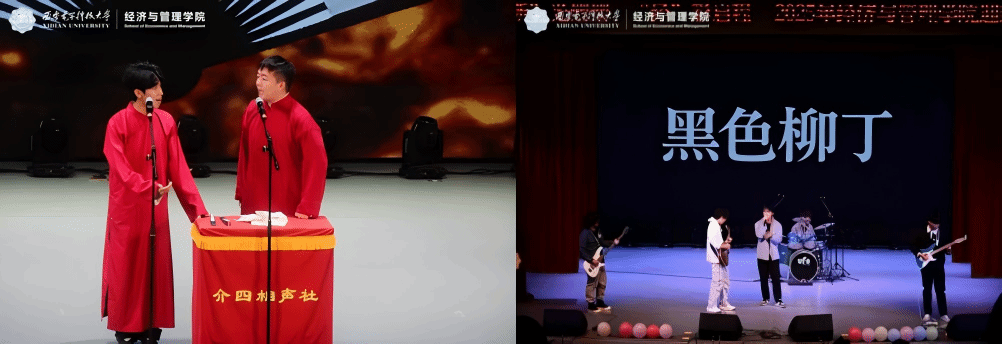 语言与器乐节目同样亮点纷呈。由“介四相声社”带来的《礼仪漫谈》,以幽默诙谐的语言和贴近生活的素材,引得台下笑声连连、掌声不断,在欢乐中传递了礼仪之重;乐队表演的《Whataya Want from Me&黑色柳丁》则以其专业的演奏技巧和饱满的摇滚激情,震撼全场,展现了经管学子课堂之外的别样才华。