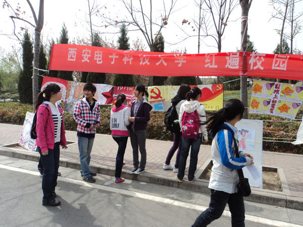 为喜迎建党九十周年,我校成立八十周年,深入推进创先争优活动,深化“爱国、责任、进取、荣誉”主题活动内涵,展示我校大学生“与祖国共奋进,与西电共发展”的良好精神面貌,近日,经济管理学院在海棠餐厅门口举办了为期两天的“红遍校园”书画展竞赛活动。