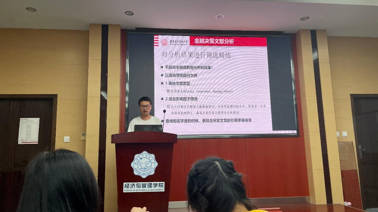 活动现场,博士研究生白军成和杜丹阳做了主题分享。白军成同学从“选文献、下载文献、选期刊”三个维度分享自己的经验感悟,推荐大家要高度关注和深入阅读所在研究领域的权威学者在顶级期刊或者权威会议上发表的文章,分享了在下载文献时可以利用的数据库、选择期刊时可以参考的网站,并为大家介绍了金融决策领域的顶级期刊目录、权威学者信息和文献分析方法等内容。杜丹阳同学与大家分享了自己整理的管理科学领域期刊资料,建议大家可以结合自己的研究领域,根据权威的期刊排名选择合适的期刊文章进行阅读;同时为大家介绍了在下载文献、查看期刊详细信息时可以用到的一些小工具,并为同学们进行了演示。