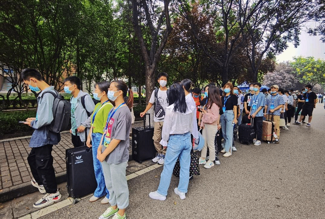 随着大巴车缓缓停下,志愿者们积极上前卸载行李、核对行李信息,并带领新生前往入住宿舍。志愿者们不辞劳苦地往返于新生宿舍和大巴接送点之间,热心主动接过新生手中的行李,每个人都勤勤恳恳、踏实肯干。