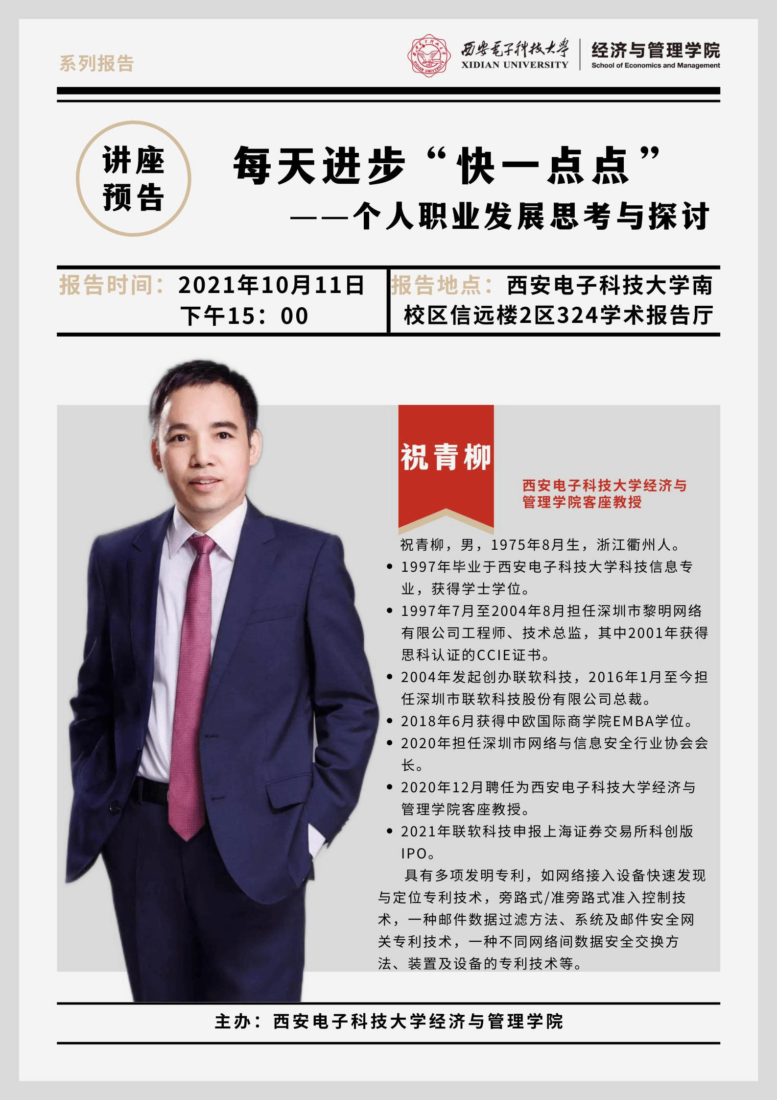 如何从理工男成为行业顶级技术专家,从技术专家成为创业者?如何带领团队成为当前火热的网络安全行业内受人尊敬的公司?我校97届校友祝青柳结合个人亲身经历,分享如何脚踏实地,以每天进步“快”一点点的方式,让自己和团队不断进步,给校友们提供一个他亲身实践的独特职业发展思路。该报告以引导和助力大学生早日认识自己、做好职业生涯规划为目的,如何少走弯路?实现每天进步快一点。