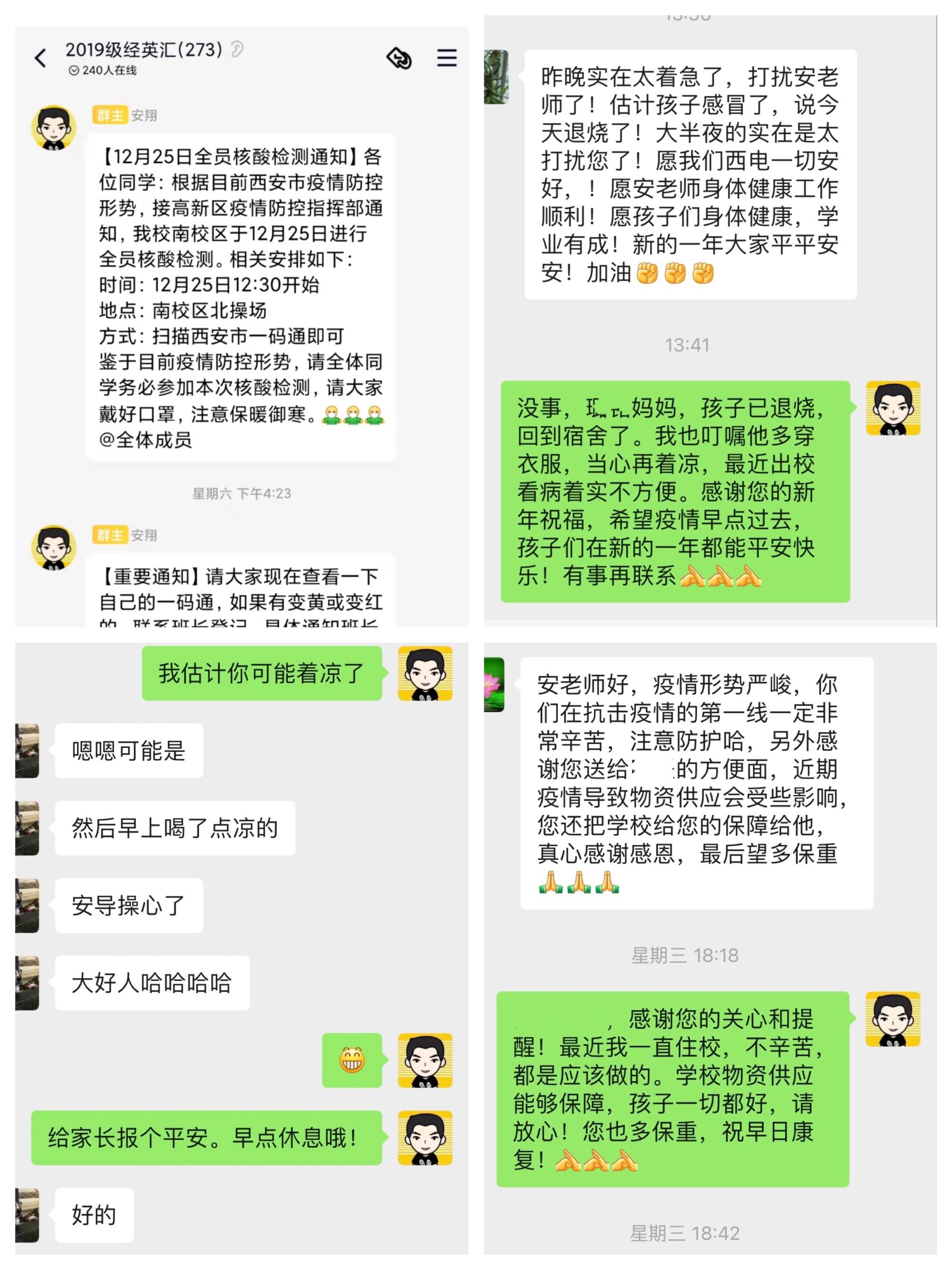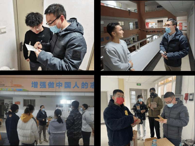 12月21日,疫情形势稍显吃紧苗头,辅导员安翔就回家收拾好行李,搬到学生宿舍里住下了。没想到宿舍刚刚收拾停当,西安市就发布了封城通告。安心驻扎在学生宿舍后,他逐一走访所带两个年级的54间宿舍,与学生谈心谈话,深入了解学生思想动态,密切关注学生身心健康状况,耐心解答疫情防控政策、期末考试、学校物资保障等学生关心的问题,对学生遇到的实际困难给予及时帮助。“与学生在一起,学生心里踏实,我心里也踏实。新冠疫情给工作带来了不少挑战,越到这个时候,越要用心站好自己的岗,守好自己的阵地,让学校放心,让家长放心。”安翔说道。