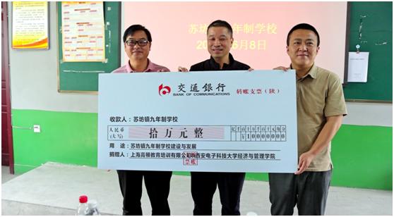 会上,经管院联合上海高顿教育集团引进帮扶资金十万元向苏坊镇九年制学校捐赠,用于学校体育基础设施建设。