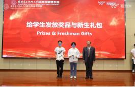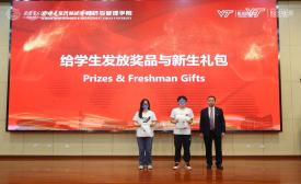 现场领导为开学第一课评测结果优秀的五位学生、参与陕西省中外合作办学学生英语演讲比赛初赛的两位学生、中美班短视频大赛获奖者两位学生颁发奖品,并为新生代表们发放新生礼包。同学们共同启动2022级中美班项目纪录片开拍仪式。