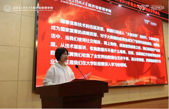 新生代表王珂在发言中表示大数据管理与应用项目凝聚着中美两国教师的心血,也为同学们提供了国际化的教育资源。大家应开拓国际视野,提升专业技能。从身边的每一件小事做起,认真吸收每一节课的知识,认真完成每一项作业。心怀梦想,拥抱光明的未来。