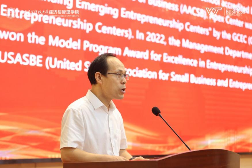 张进成副校长为典礼进行致辞。他对项目新生表达了祝贺和欢迎,对项目表达了肯定,认为教育国际化是大势所趋,西电-弗吉尼亚理工中美合作办学项目,引进了顶级美国商科教学资源,提供了一流专业学科支撑。他为同学们分享了几点感悟:一是希望大家在学期间勤勉学业,能够“学贯中西,会通古今,融合文理”;二是希望大家尽快完成由高中生向大学生身份的成功转变;三是希望大家能够借助中美合作办学这个得天独厚的国际化平台,充分了解国际环境,深入拓宽国际视野,真正通晓国际规则,做中美文化交流使者。他还强调,希望两校能够以此次合作为契机,以国际化人才培养为纽带,引领中美两国在数智时代高端人才培养和科研合作方面继续携手前行,成为两国高等教育开放合作的成功范例,并为中美项目的美好明天送上了祝福。