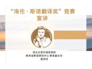袁西玲进行了第十届“海伦∙斯诺翻译大赛”的竞赛宣讲,海伦∙斯诺翻译大赛是由陕西省翻译协会、北京大学中国埃德加·斯诺研究中心、美国南犹他大学、西北大学、美国海伦·福斯特·斯诺基金会联合主办的国际性翻译赛事。袁西玲从竞赛特点、评审流程、启动仪式和赛季、竞赛赛题风格及难度展示等几个方面为同学们详细介绍了竞赛情况。