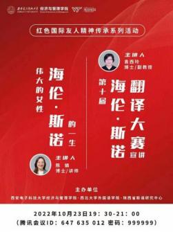 (通讯员:班嘉欣)2022年10月23日晚,中美班红色国际友人精神传承活动主题班会以线上方式举行,班会特别邀请海伦·斯诺研究的创始人、陕西省斯诺研究中心高级顾问安危、西北大学外国语学院副教授、陕西省斯诺研究中心常务副主任袁西玲、西北大学外国语学院讲师、陕西省斯诺研究中心秘书长陈娟作为主讲嘉宾,为中美班学生就海伦∙斯诺的架桥人生和架桥精神进行了主题分享。