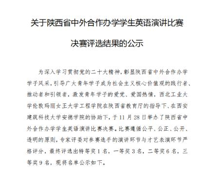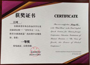 据悉,本次陕西省中外合作办学学生英语演讲比赛主题为“青春献礼二十大,胜任全球谱新篇:The Voice of Youth, the Power of Global Competence”,是由陕西省教育厅指导,陕西省高等教育学会中外合作办学分会主办的英语类赛事,激发了广大青少年爱党、爱国热情,展现了中外合作办学学生的良好风貌。本次中美班学生首次参加就取得良好成绩,是学生本人长期努力基础良好的表现,也是中美合作办学项目重视学生国际视野打造和英语语言能力提升、重视学生用国际语言讲述中国故事、重视以赛促建的结果,这一佳绩也给项目其他同学带来很大的激励。今后,中美合作办学项目将持续鼓励学生参与各类赛事,积极给予比赛指导和建议,争取在相关赛事上获得更多成绩,培养更多的具有国际胜任力的栋梁之才。