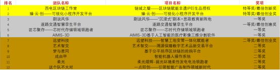 在决赛结束后,经过分数统计,决出了校赛最终的特等奖、一等奖、二等奖等团队。获奖团队与项目如下: