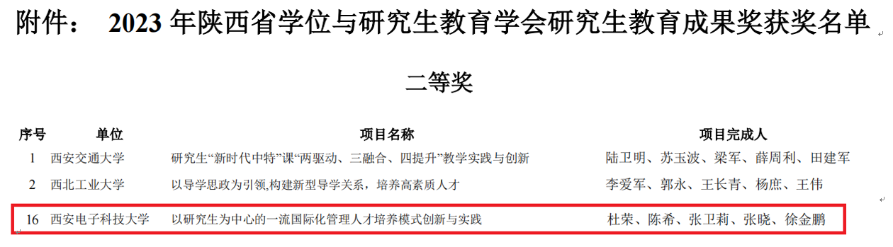 近日,陕西省学位与研究生教育学会公布了2023年陕西省学位与研究生教育学会研究生教育成果奖评审结果,由我院杜荣教授等人完成的《以研究生为中心的一流国际化管理人才培养模式创新与实践》成果获陕西省学位与研究生教育学会研究生教育成果奖二等奖。