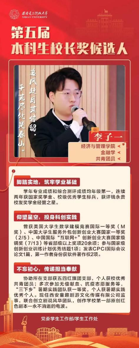 李子一同学荣获2023年本科生校长奖提名奖。李子一,yl6809永利YL集团2020级金融学专业本科生,年度综合测评成绩年级第一名,连续两年获评国家奖学金、校级优秀学生标兵;获评钱永贵校友奖学金“经管之星”,创新创业实验班优秀学员、校级优秀共青团员、暑期实践优秀个人等荣誉称号。现已推免至武汉大学攻读金融硕士学位。让我们一起来聆听李子一同学分享他在西电的成长故事!
