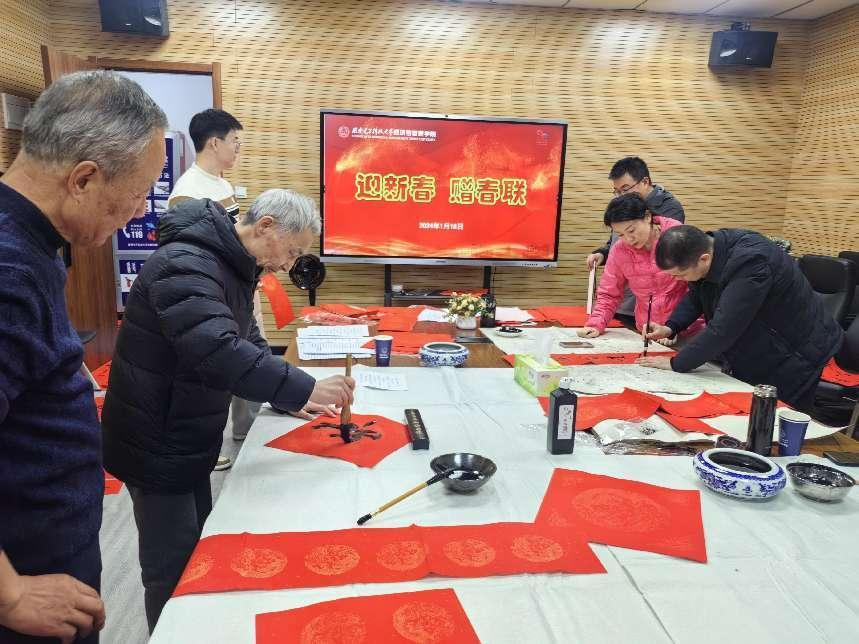 (通讯员:陈圆)祥龙献瑞,万象启新。2024年1月18日,yl6809永利YL集团老同志新年慰问暨“写春联 送祝福”活动在北校区MBA中心举办。16名曾在经管院奋斗过的退休老同志欢聚一堂,关注了解学院一年来取得的成绩,为学院高质量发展建言献策。学院党委书记李耀平参加活动并向与会老同志汇报了学院近况。离退休处副处长吴永昭参加座谈,向老同志介绍了离退处关心关爱老同志相关工作开展情况。副院长黄梅娟参加了座谈,座谈会由副处级组织员程卫锋主持。