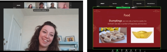 为了方便大家进行充分的交流,美方导师们将参加活动的师生进行了分组,中美项目学生们用精心制作的PPT展示了春节的历史、习俗和文化内涵,大家通过PPT展示了春节期间的传统习俗,如拜年、发红包、吃饺子、放鞭炮等,大家用英语向美方导师们介绍了春节的起源和演变,用丰富的图片和视频展示了自己所在地区的年俗。从古代的年兽传说到现代的团圆年夜饭,从热闹的舞龙舞狮到寓意吉祥的春联,学生们详细阐述了春节在中华文化中的重要地位,还分享了自家过春节的趣闻轶事,让美方导师们感受到了春节的独特魅力和温馨氛围,他们纷纷表示,通过这次活动,对春节有了更加深入的了解,也更加欣赏和尊重中国的传统文化,此次活动给他们带来了独特的文化体验。