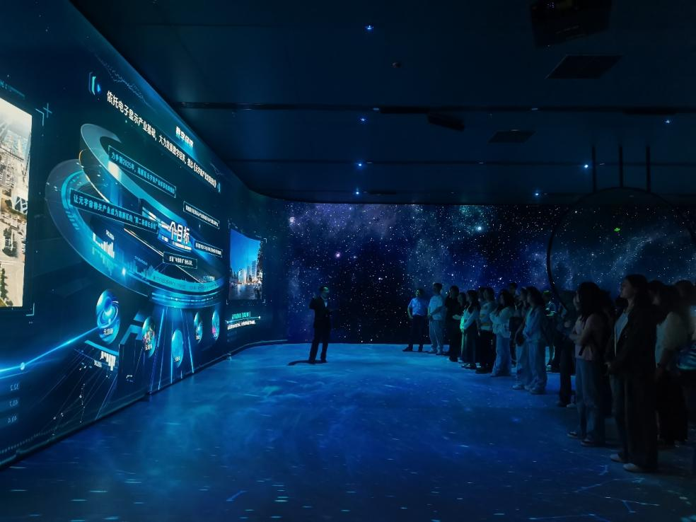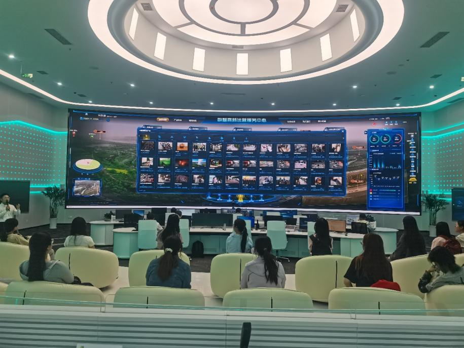 一行人首先前往了咸阳市高新区数字会客厅。在陕西崇文科技信息有限公司负责人张崇君的陪同下,深入了解了咸阳市高新区的交通、区位和发展历程,及四大主导产业——电子显示、生物医药、高端装备制造、新型合成材料的发展概况。在数智高新运营服务中心,大家全面了解了在数字经济领域的数字化转型应用实例,包括全景高新、产业智治、城市治理、智慧应用和政府运行等多个方面。同学们通过这些实际案例,对大数据的应用场景和数字经济的重要性有了更为深刻的认识,对未来的职业规划也更加清晰。