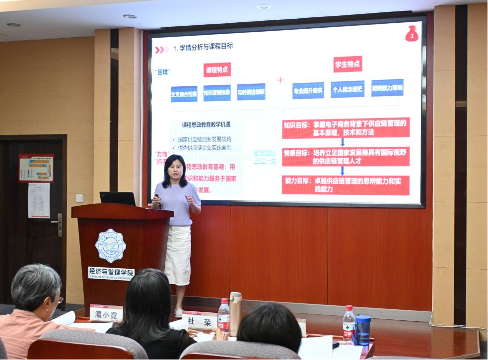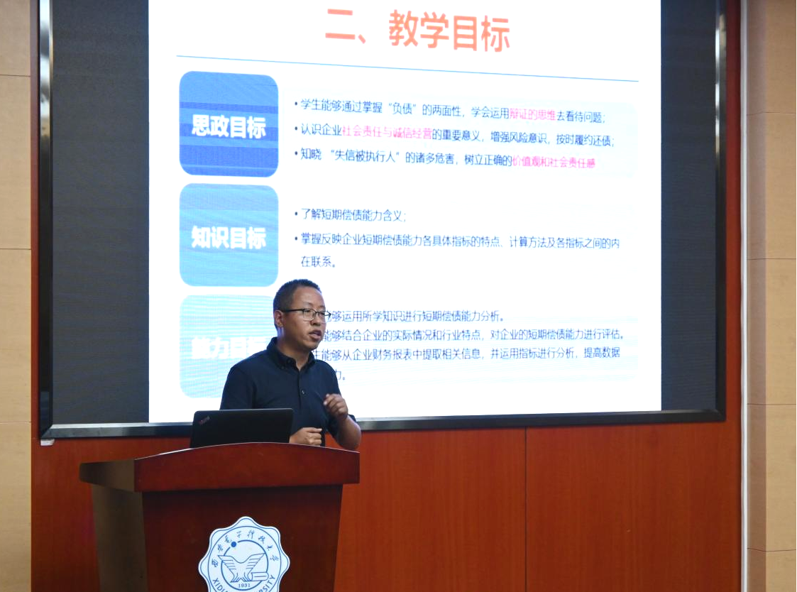 活动中,五位教师结合专业特点,巧妙融入思政元素,展示了创新教学设计。信息管理系马晶老师结合新闻时事和法规,提升理论知识与思政的契合度;工商管理系史会斌老师聚焦“短期偿债能力分析”,强调其重要性;管理工程系王方老师以《山海情》案例为载体,进行多维度思政育人;经济与金融系郑冠群老师深入讲解波浪理论在证券投资技术分析中的应用;电子商务系刘晨老师紧扣国家战略,展示《供应链电子商务》课程中的思政创新。