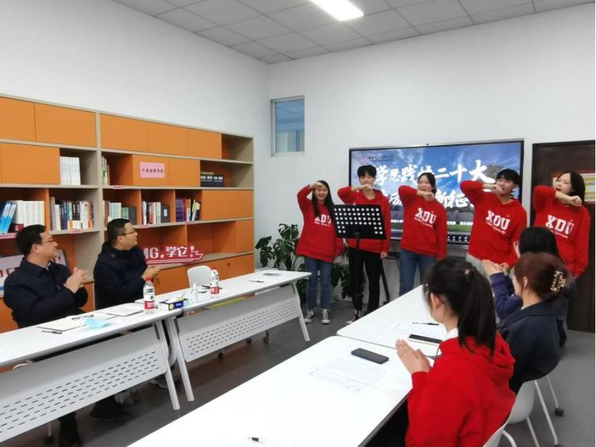 支部党员同志结合前期自学党的二十大精神,用朗诵、歌曲形式来汇报了学习体悟。韩锦超同志用诗朗诵 《青春》(节选),传递青年学子正值青春年华,为祖国贡献力量正当时的正能量;陈扬、马骏同志结合自身经历自述《与共和国同行》、张乐妍同志朗诵《学习二十大 永远跟党走 奋进新征程》,让大家深刻感悟到党的二十大胜利召开是实现中国梦路上的一个里程碑。支部刚递交入党申请书的高子睿同志、积极分子刘一潼同志、发展对象鹿勇哲同志、预备党员王佳晖同志、正式党员曾靖同志带来合唱《我们都是追梦人》,充分体现支部向党追逐的脚步从不停歇。