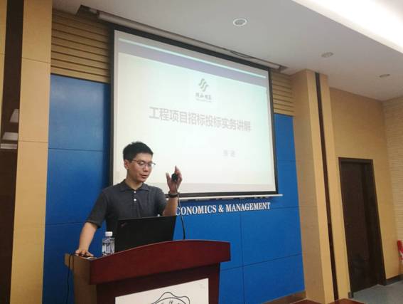 张进为学子作了题为“工程项目招标投标实务讲解”的报告,他以“天堂门坏了”这个故事引出报告内容,引导学子思考为什么“中国能够次次中标”?紧接着他从企业的角度对招投标过程中的实务基础知识、法律法规和实施过程等进行了讲解和举例说明,并多次强调不同地区的招投标规定会有细节上的不同,而这些细节恰恰可能成为中标或者废标的关键因素。随后他以乾坤湾合建站工程施工项目为例,详细介绍了招标和投标的实施过程。刘纯振为学子作了题为“防水工程管理实务”的报告,对防水工程在设计、招标、施工等环节中的过程把控和新建住宅工程、老旧小区改造工程中的防水失败案例等内容进行了系统讲解。他多次强调,防水工程投资占整个工程项目投资的比虽小,但对于工程项目后期运营管理至关重要,因此对于涉及防水的工程项目要特别重视工程项目的管理工作。