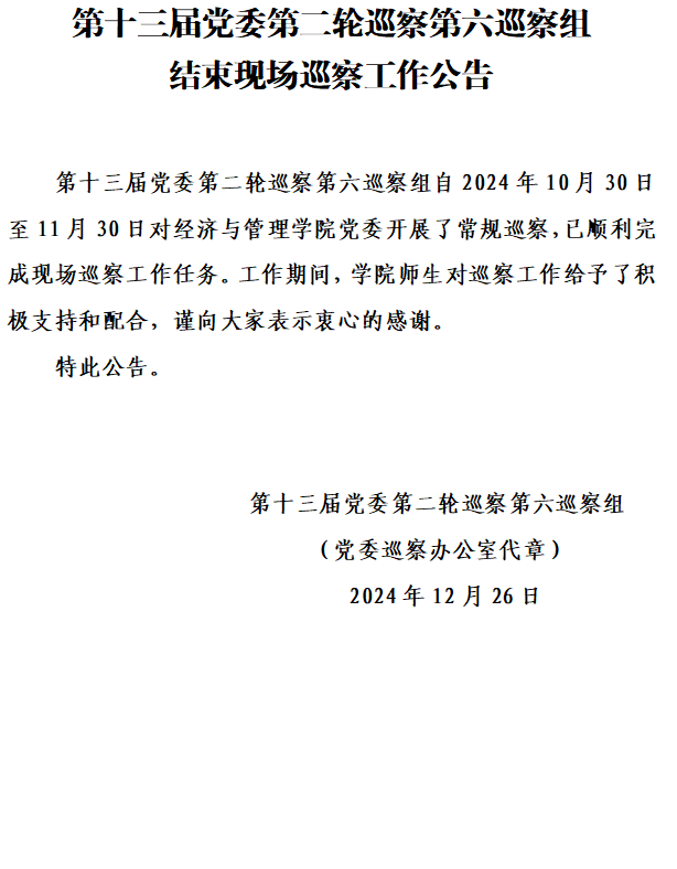 第十三届党委第二轮巡察第六巡察组 结束现场巡察工作公告