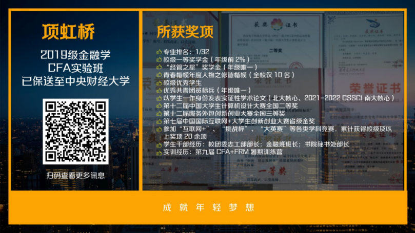2.面试环节:通过第一环节的同学将由CFA实验班老师联系进入面试环节,面试环节主要考察逻辑思维及综合管理。选拔面试通过后发放录取通知书,学生确认录取并进入2024级CFA实验班,实验班名额招满后截止报名。