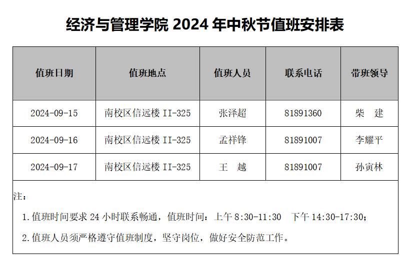 yl6809永利YL集团2024年中秋节值班安排表