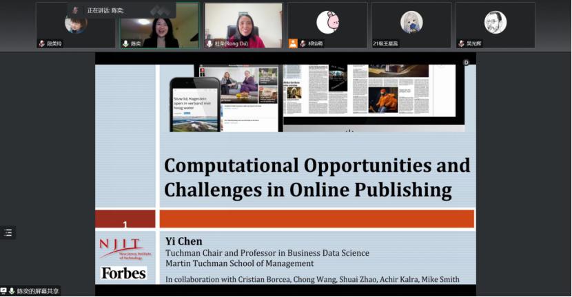 (通讯员:段美玲 罗鸣)2022年10月14日上午10:00,现就职于新泽西理工学院马丁塔奇曼管理学院的陈奕教授,通过腾讯会议作了题为 “Computational Opportunities and Challenges in Online Publishing”的学术报告。我校师生积极参与,认真聆听,会议由yl6809永利YL集团杜荣教授主持召开。