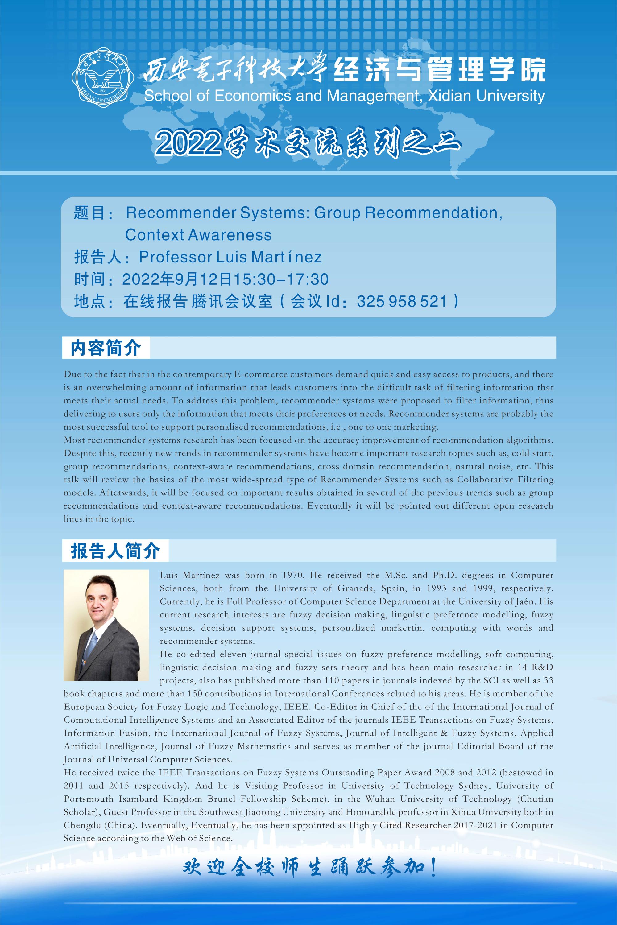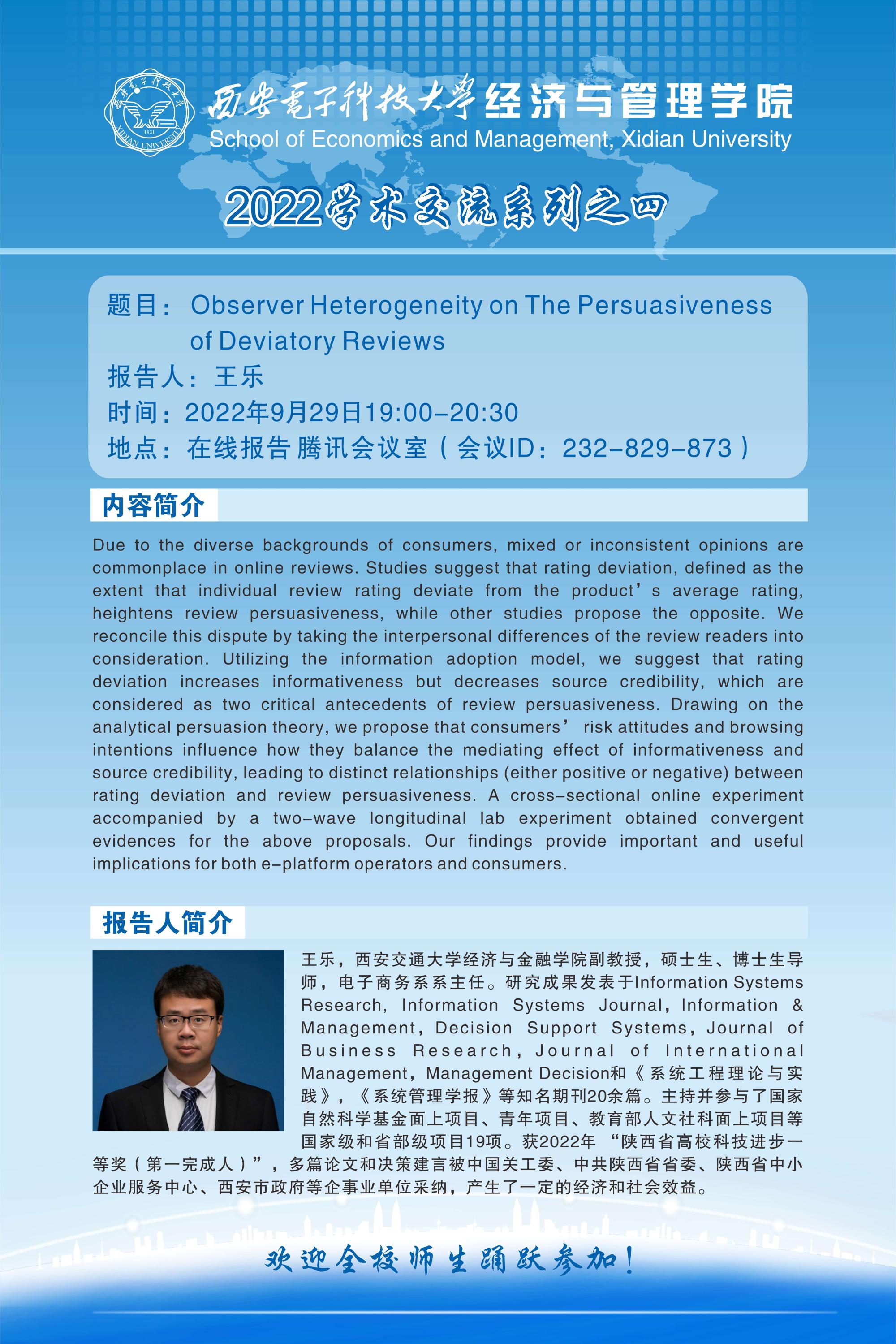 (通讯员:段美玲 罗鸣)2022年10月14日上午10:00,现就职于新泽西理工学院马丁塔奇曼管理学院的陈奕教授,通过腾讯会议作了题为 “Computational Opportunities and Challenges in Online Publishing”的学术报告。我校师生积极参与,认真聆听,会议由yl6809永利YL集团杜荣教授主持召开。陈奕教授作主题报告报告会上,陈奕与大家讨论了在线出版模式在创收和用户参与方面面临的机遇和挑战,并在对用户和广告商历史行为进行分析的...