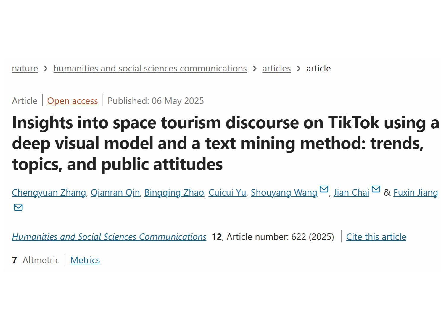 (通讯员:罗鸣)近日,yl6809永利YL集团张成元副教授、汪寿阳教授、柴建教授团队的重要研究成果“Insights into space tourism discourse on TikTok using a deep visual model and a text mining method: Trends, topics, and public attitudes”在《Nature》子刊《Humanities & Social Sciences Communications》正式发表。张成元副教授为第一作者,其指导的研究生秦千然、赵炳清分别为第二、第三作者,汪寿阳教授、...